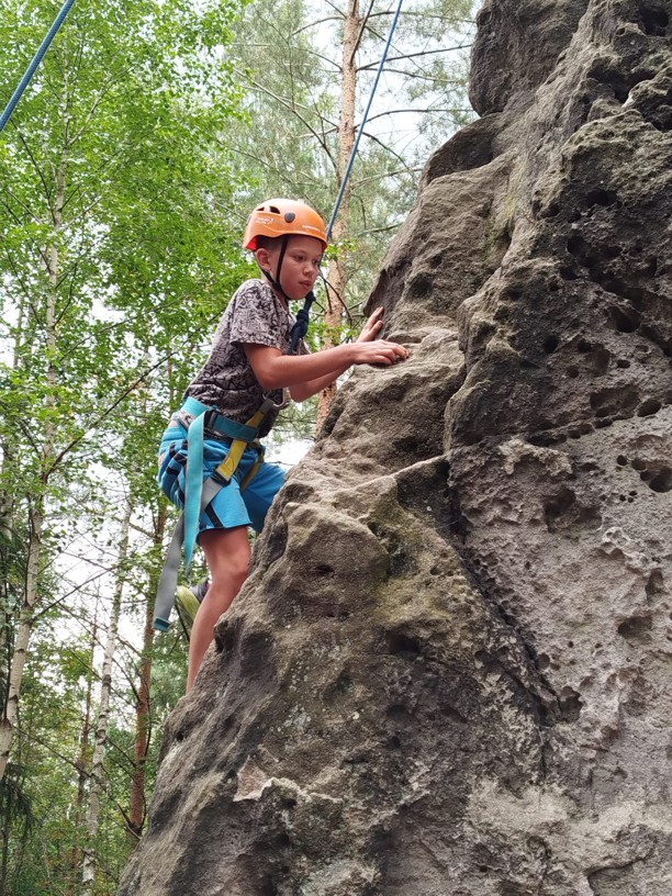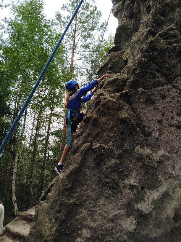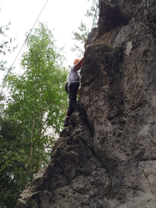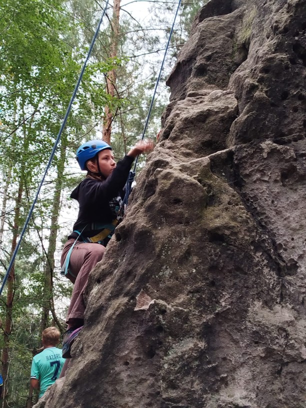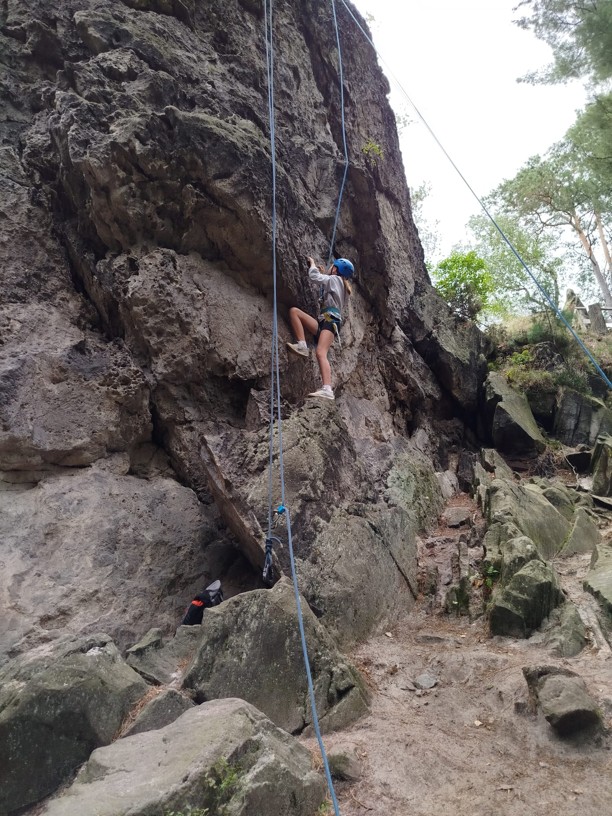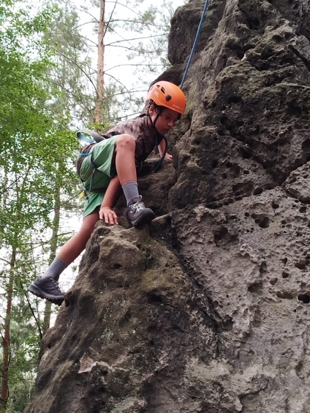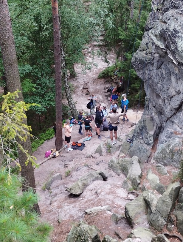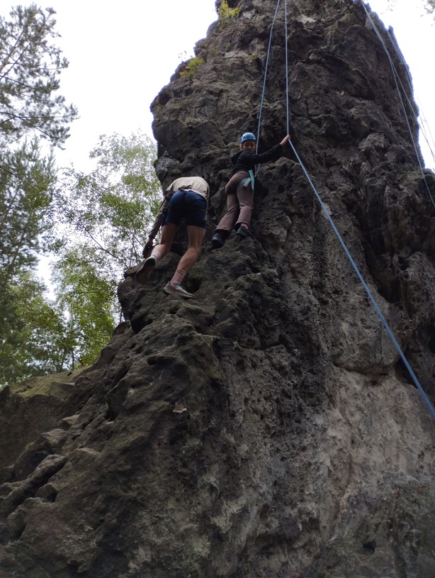 Ve středu jsme vyrazili pěšky na hrad Frýdštejn, kde jsme si dali oběd a užili si krásný výhled. Odpoledne následoval jeden z vrcholů kurzu – skalní lezení a slaňování na Pantheonu. Pro mnohé to byl nezapomenutelný zážitek a příležitost překonat sám sebe. Večer jsme se vrátili k práci na erbu, který jsme společně dokončili.